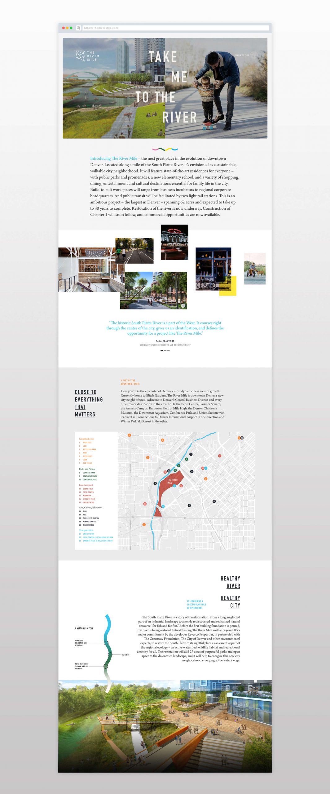 Denver is one of the fastest growing cities in the U.S. As part of a comprehensive solution for sustainable growth in the metro area, Revesco Properties has begun planning a bold new urban district that will eventually occupy the current site of the Elitch Gardens amusement park. Strada has helped Revesco shape the vision and identity of this mixed-use, mixed-income “new city neighborhood” – by naming it The River Mile, celebrating its active, mile-long frontage on the South Platte River, and positioning it as a model of conscientious planning, design and environmental revitalization. Following a rigorous review process, the plan will come to life deliberately and incrementally, in several phases, over two to three decades.